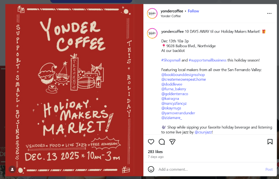 One café I like, Yonder Coffee | Shop & Coffee Cart, does this well with their Holiday Makers Market reels and posts that invite locals to “come through to #shopsmall & #shoplocal”: